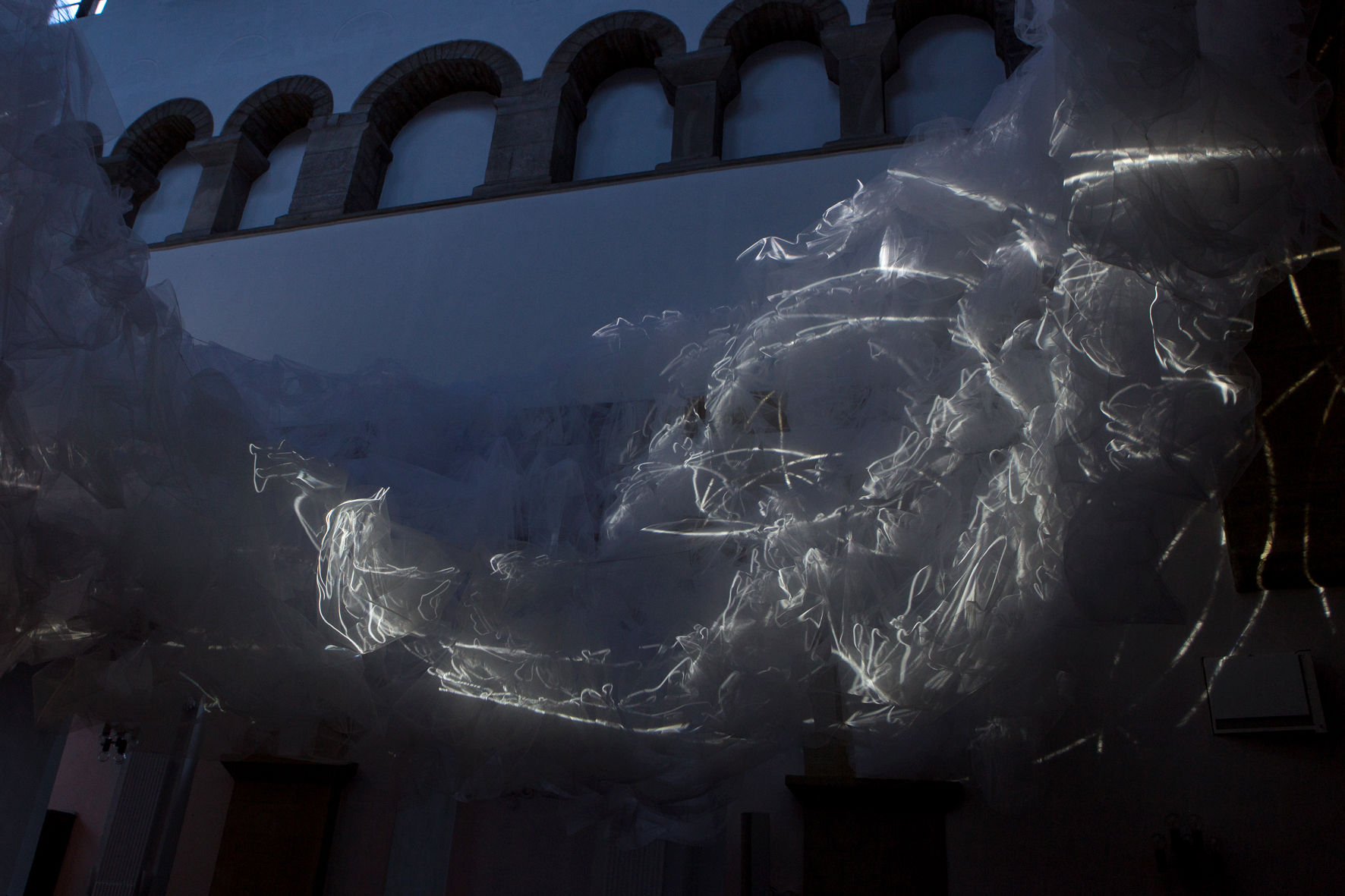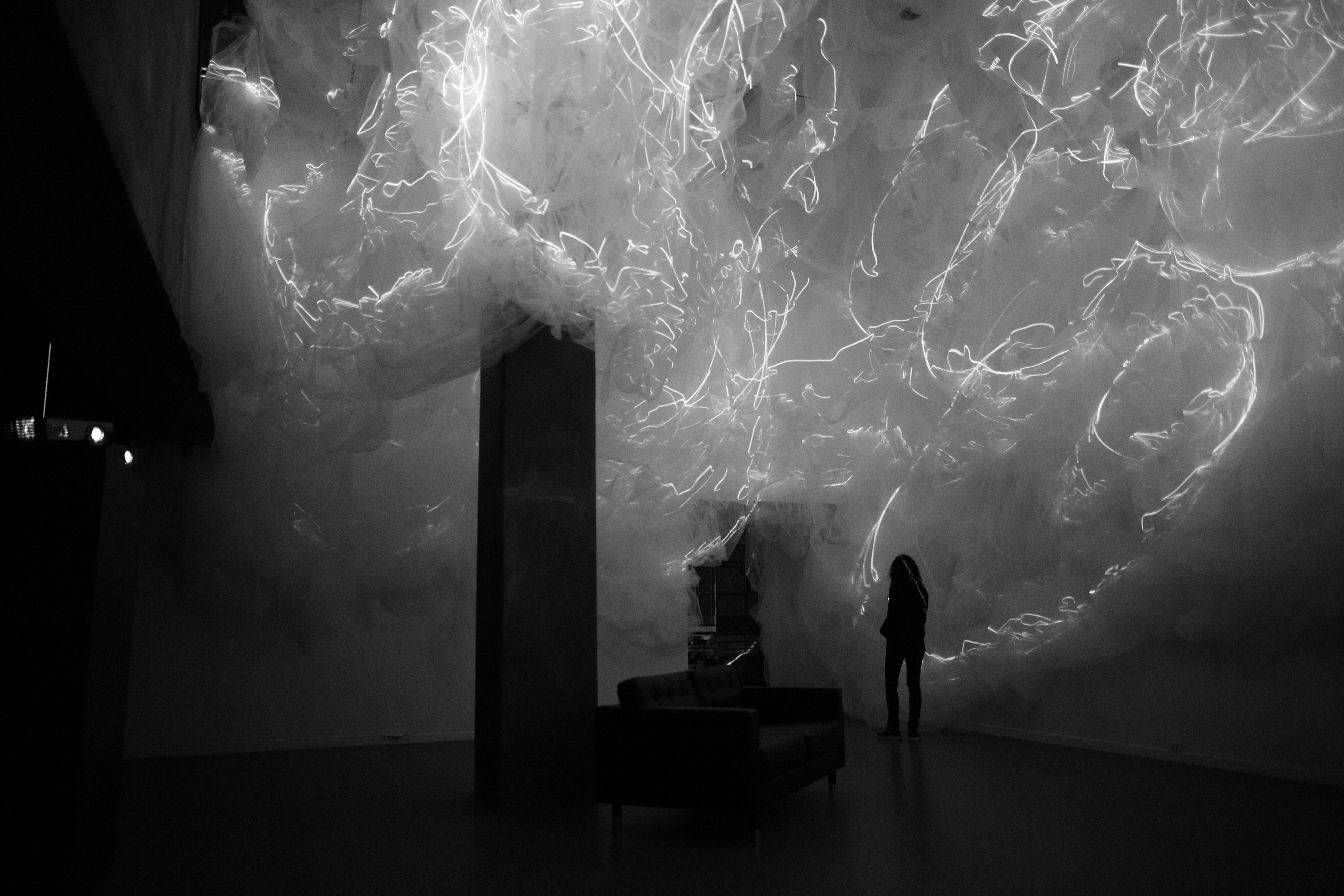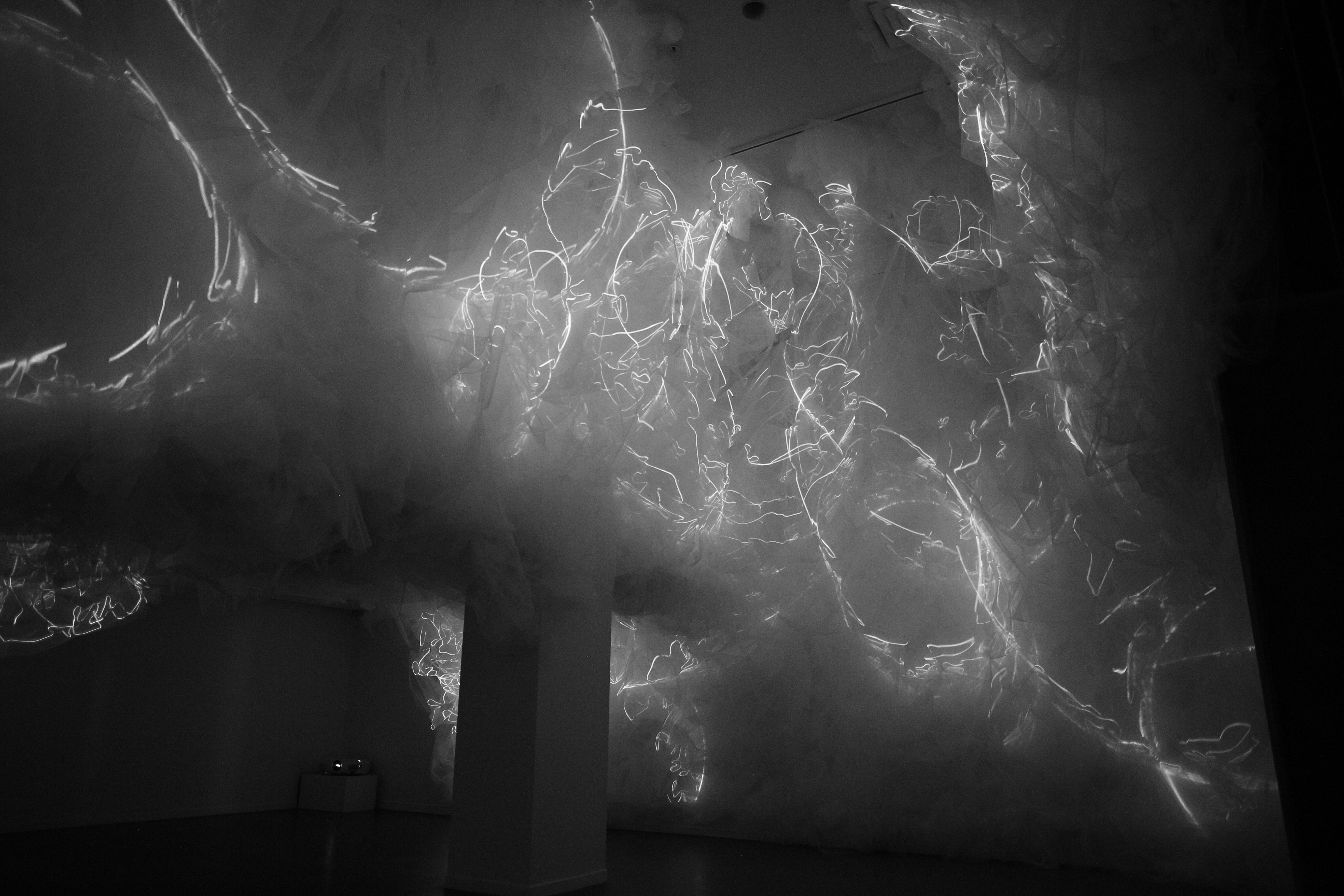 BREATH OF THE SEA opened August 29th in Halifax, Nova Scotia at Dalhousie Art Gallery in the show "Atmospheric Events: James Geurts, Christine Sciulli, Andreas Schmid", part of RESPONSIVE: International Light Art Project Halifax. Breath of the Sea is a 10 channel video, site specific, architectural intervention commissioned by Dalhousie Art Gallery and co-produced with the Anna Leonowens Gallery, NSCAD University, with generous support of the Canada Council for the Arts. The fabric and video work swarms through low ceiling spaces into the 63'x 22' x18' high brutalist gallery, and is also viewed from the mezzanine above via four large irregular hexagonal portals.