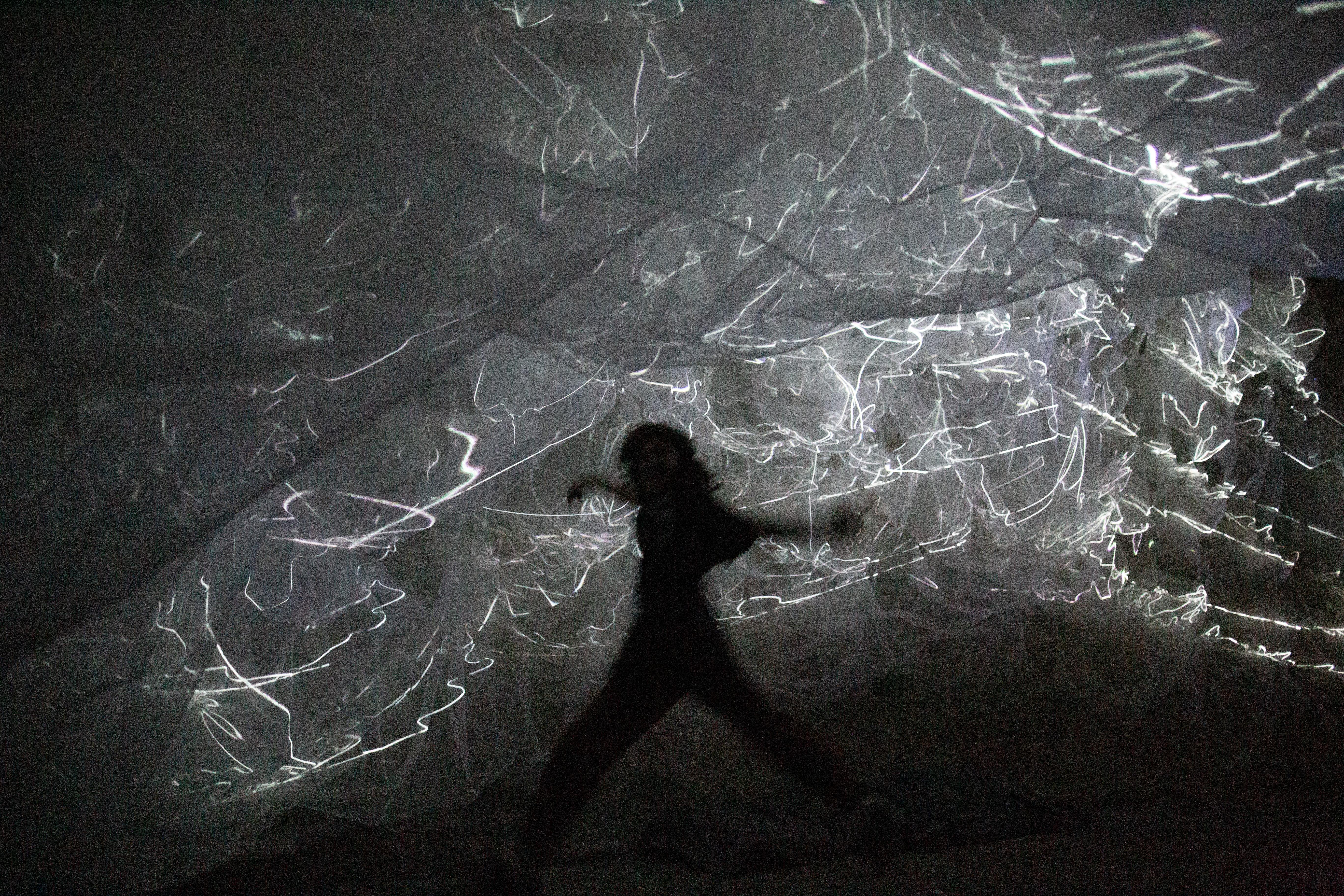 BREATH OF THE SEA opened August 29th in Halifax, Nova Scotia at Dalhousie Art Gallery in the show "Atmospheric Events: James Geurts, Christine Sciulli, Andreas Schmid", part of RESPONSIVE: International Light Art Project Halifax. Breath of the Sea is a 10 channel video, site specific, architectural intervention commissioned by Dalhousie Art Gallery and co-produced with the Anna Leonowens Gallery, NSCAD University, with generous support of the Canada Council for the Arts. The fabric and video work swarms through low ceiling spaces into the 63'x 22' x18' high brutalist gallery, and is also viewed from the mezzanine above via four large irregular hexagonal portals.