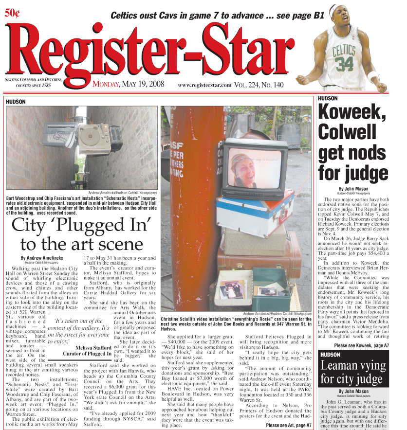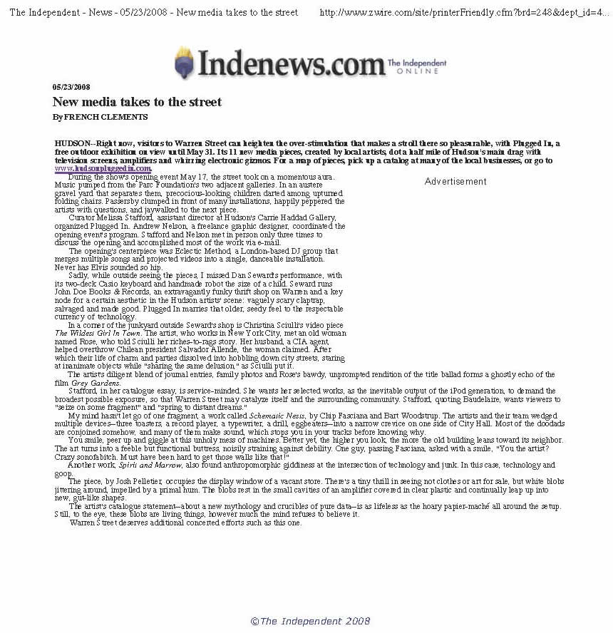 This exhibition was mounted along Hudson’s main thoroughfare: Warren Street. Participating artists included: Isabel Barton (Hudson, NY), Mark Gregory (Albany, NY), Giorgio Handman (Hudson, NY), Kathe Izzo (Hudson, NY), Ingrid Ludt (Albany, NY), Jesse Matulis (Cohoes, NY), Jillian McDonald (New York, NY), Michael Oatman (Troy, NY), Fernando Orellana (Troy, NY), Jonathan Osofsky + Jasdeep Gosal (Hudson, NY), Christine Sciulli (New York, NY), Bart Woodstrup (Troy, NY) + Chip Fasciana (Albany, NY), Bryan Zanisnik (New York, NY). Plugged In was sponsored by the Columbia County Council on the Arts and made possible with public funds from the New York State Council on the Arts Electronic Media and Film Program. GET PLUGGED IN