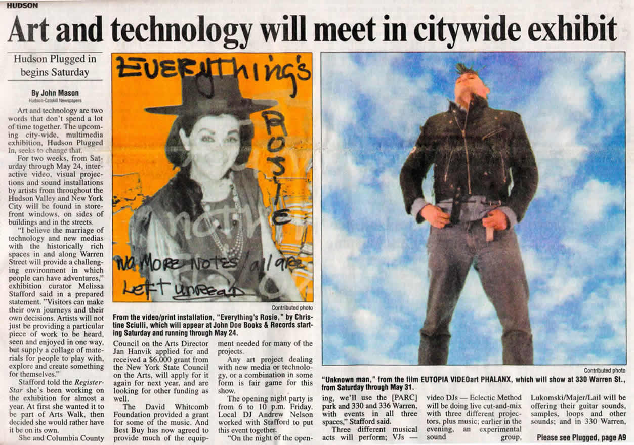 "Everything's Rosie" was seen at PLUGGED IN, Hudson :May 17th thru May 29th 2008:, curated by Melissa Stafford, PLUGGED IN showcased new media works being created by artists throughout the Hudson Valley and beyond including sound, performance, digital and video art and interactive works. Plugged In Brochure and Map